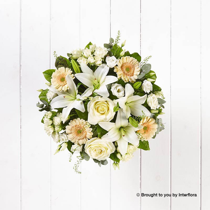 Mellow Meringue Hand-tied features ivory large headed roses, white LA lilies, white lisianthus, white spray roses, cream germini and thlaspi, hand-tied with salal and eucalyptus. Our florists wrap the flowers in kraft paper and tie with ribbon, and Mellow Meringue Hand-tied is presented in Interflora Gift Box.