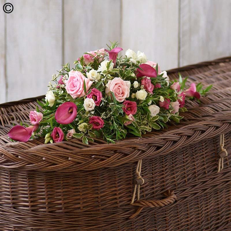 A beautiful mix of soft and vibrant pink shades, this small casket spray features roses, chrysanthemums, limonium, and lush foliage.